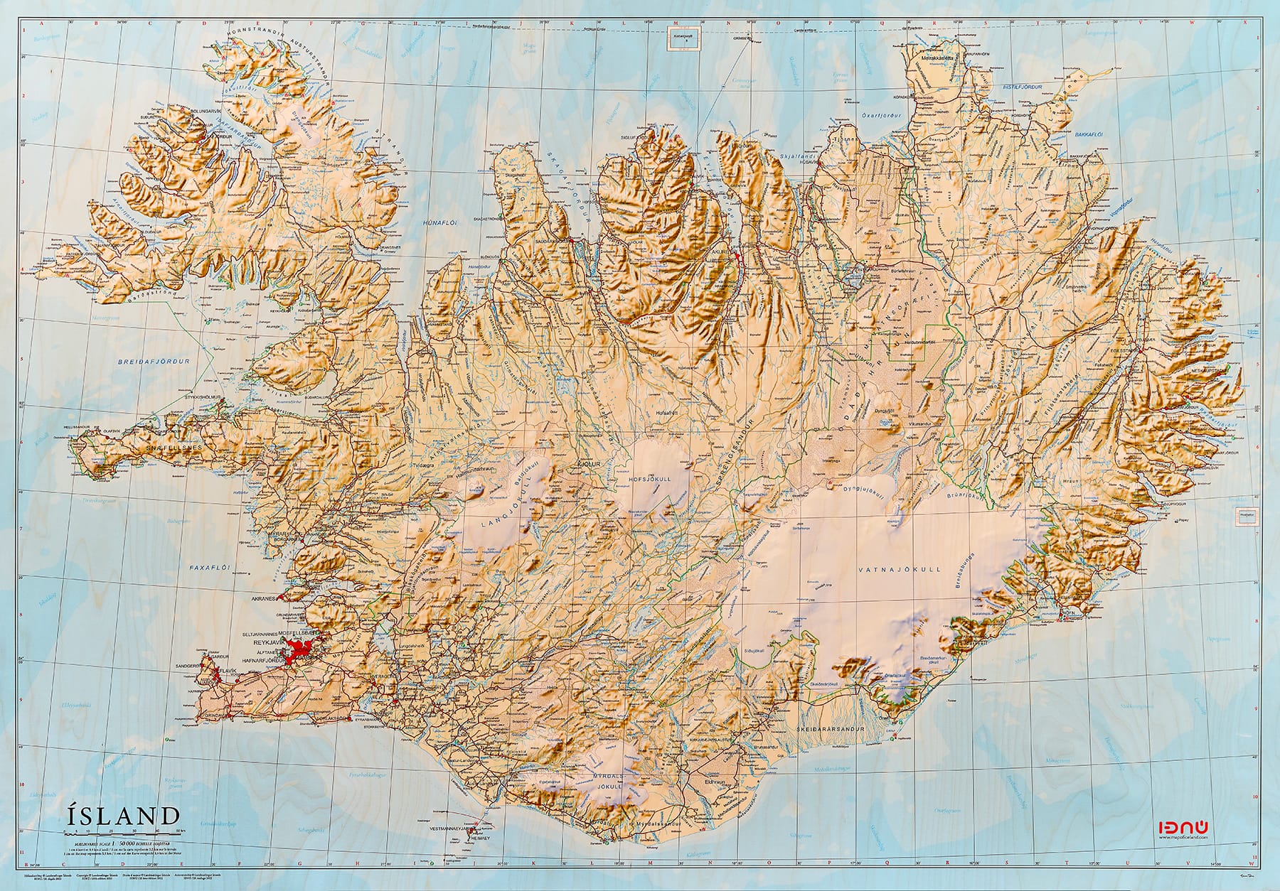 Vandað veggkort af Íslandi í mælikvarða 1:500 000 prentað á krossvið. Kortið inniheldur helstu örnefni og vegakerfi landsins.